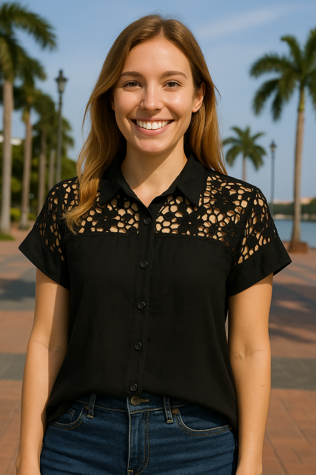 BLUSA ABOTONADA CON ENCAJE FLORAL CALADO EN HOMBROS Y ESPALDA