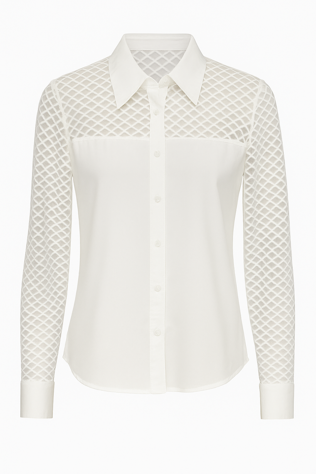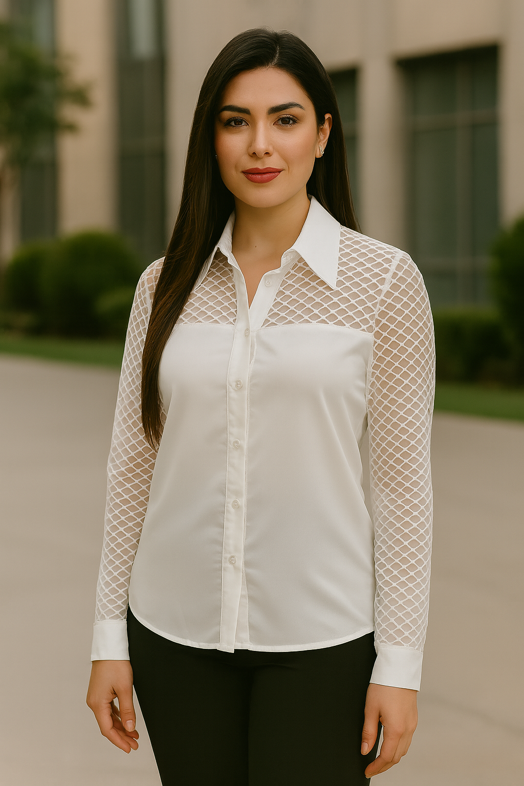 Blusa elegante y sofisticada confeccionada en tela ligera con detalles de malla en mangas y parte superior. Su diseño con cuello clásico y cierre de botones frontales aporta un estilo moderno y distinguido, ideal para quienes buscan resaltar su look con un toque de frescura y clase.