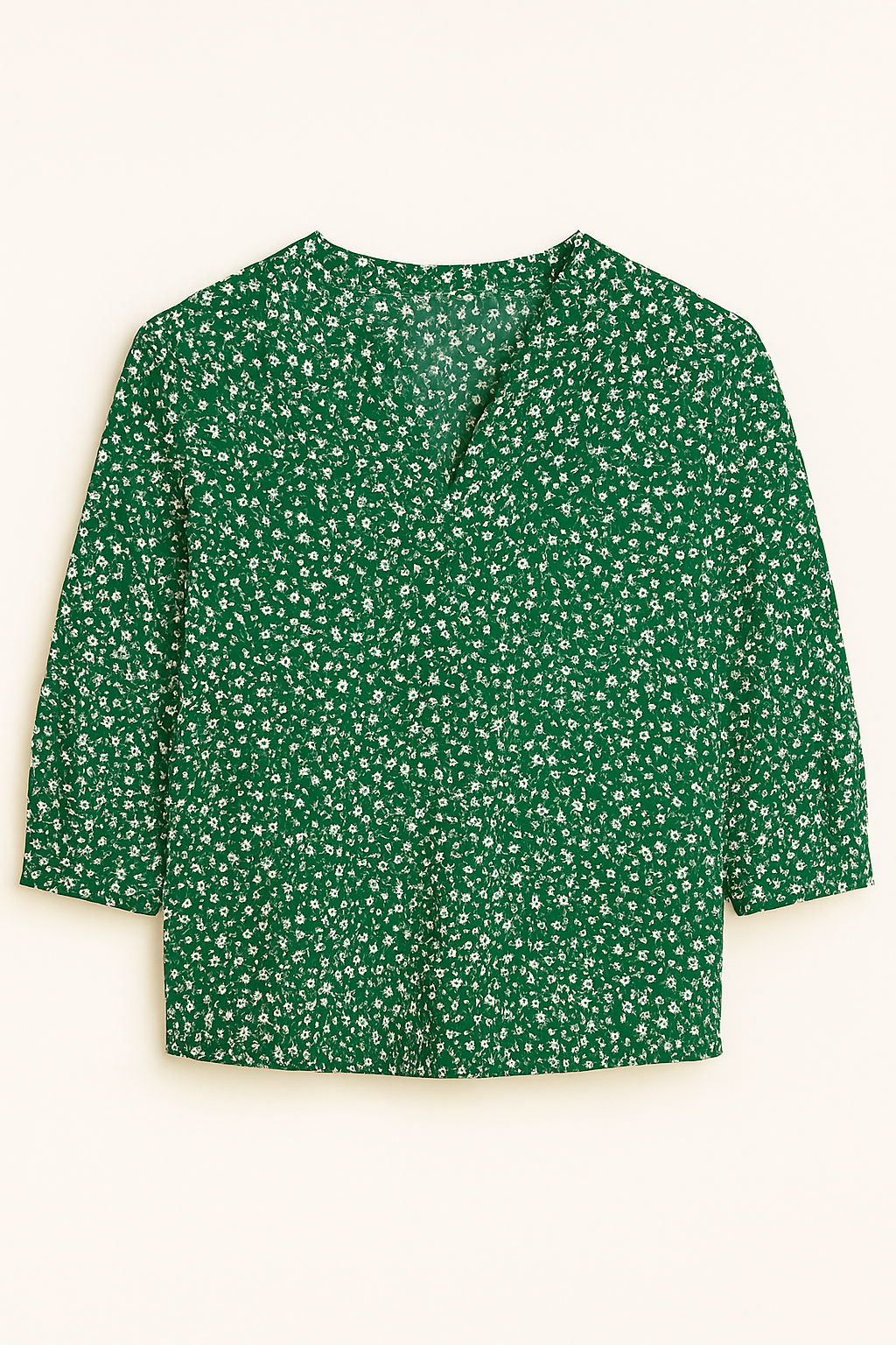 Blusa fresca y cómoda confeccionada en tela ligera, con un delicado estampado floral en blanco sobre fondo verde. Su diseño con cuello en “V” y mangas 3/4 aporta un estilo versátil y femenino, ideal para el día a día.