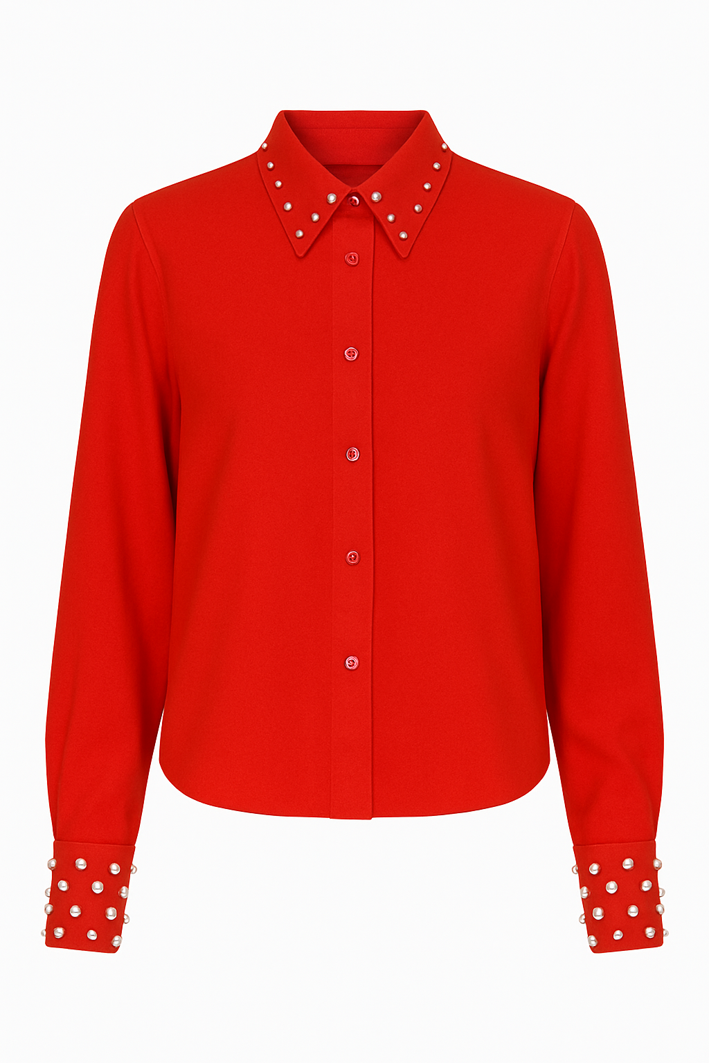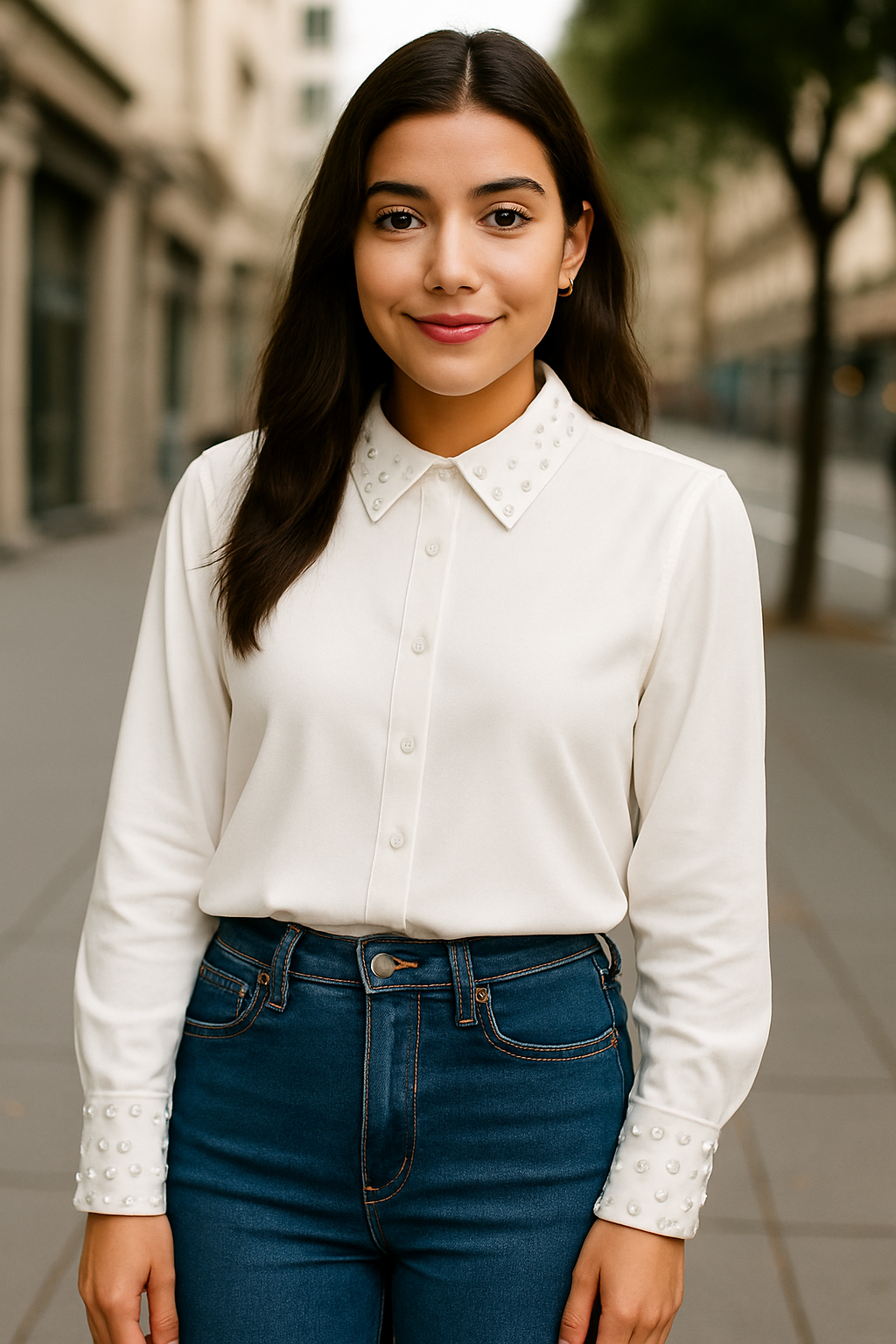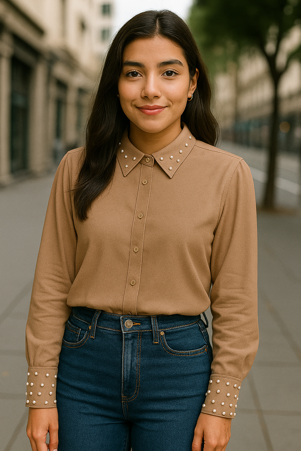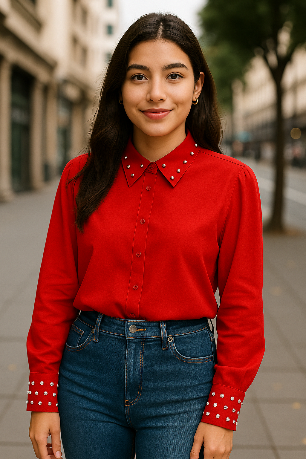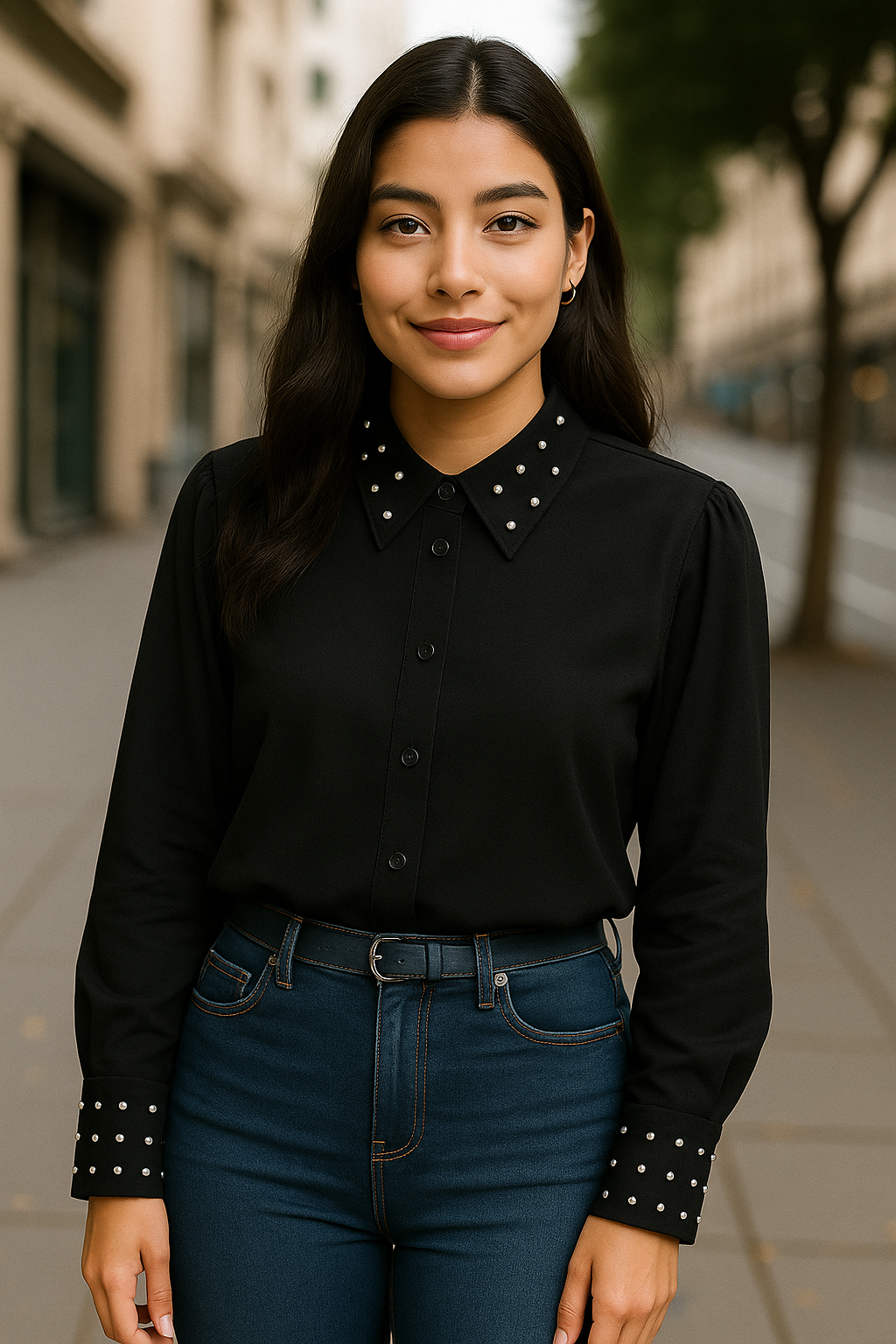 Destaca con estilo con esta blusa de corte moderno, perfecta para darle un toque audaz y elegante a tu look. Confeccionada en tela ligera de suave textura, cuenta con cuello camisero decorado con apliques metálicos tipo tachuela que realzan su diseño. El cierre frontal de botones al tono y los detalles metálicos en los puños le aportan un acabado sofisticado y único. Ideal para combinar con jeans, pantalones de vestir o faldas.