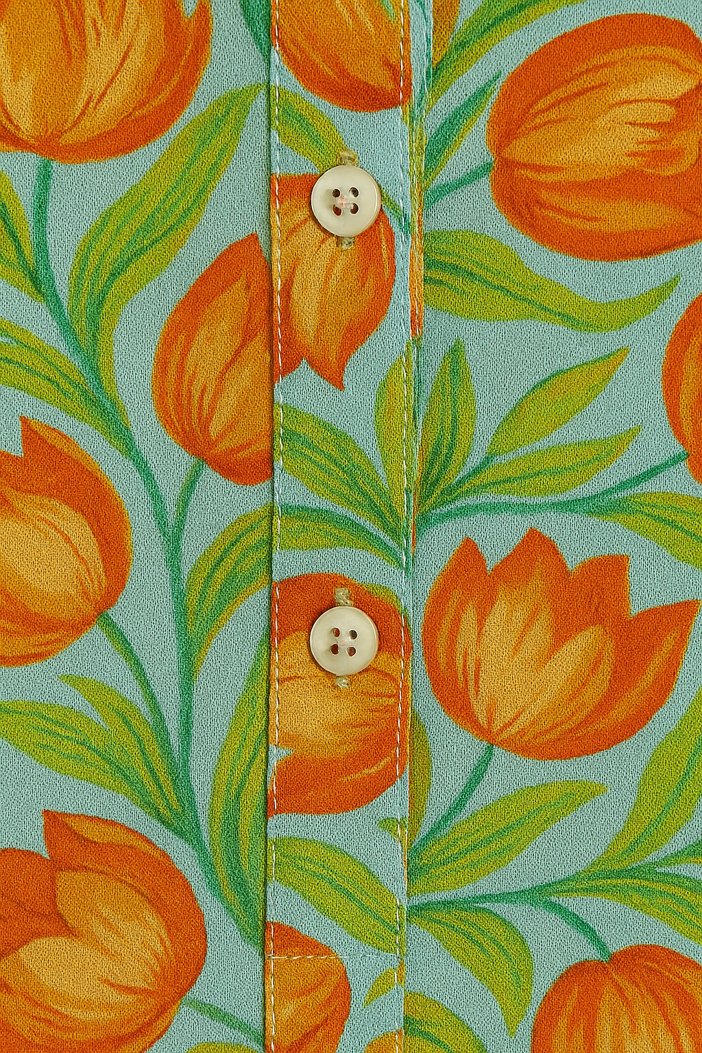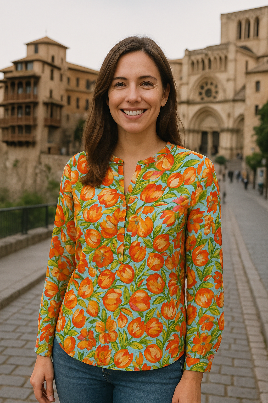 El diseño presenta un cuello redondo con abertura en V, que estiliza el escote sin ser demasiado profundo, y una botonadura parcial frontal que equilibra el estilo relajado con un toque clásico. Su estampado floral en tonos naranja, fucsia y verde sobre fondo celeste evoca la energía del verano, mientras que el bolsillo decorativo en el pecho añade un detalle práctico y visual.