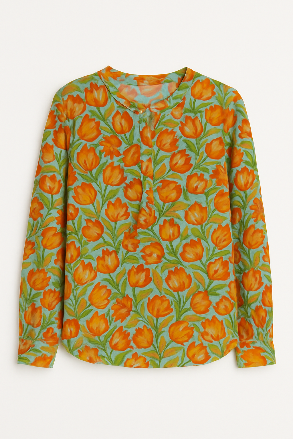 BLUSA NARANJA ESTAMPADA DISEÑO FLORAL TROPICAL MANGA LARGA