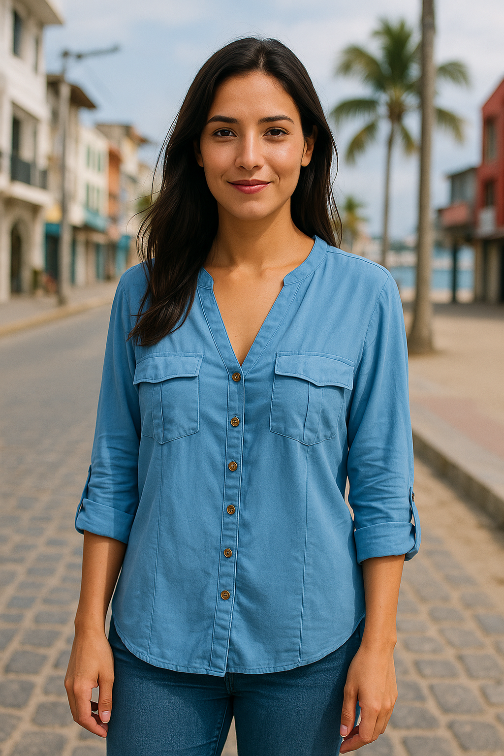 Su diseño presenta un escote en V con cuello redondeado, que estiliza el cuello y aporta un toque femenino. La botonadura completa con botones metálicos decorativos añade un detalle elegante, mientras que los dos bolsillos frontales con solapa le dan un aire utilitario, ideal para looks casuales o semiformales.