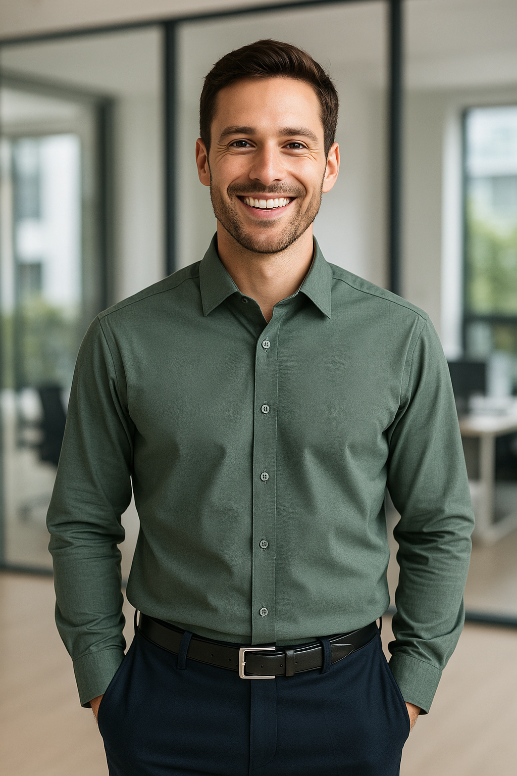 Un diseño clásico con un acabado moderno. Esta camisa de hombre en tono verde jaspeado combina elegancia y frescura, ideal para quienes buscan una prenda versátil que se adapte tanto a lo casual como a lo formal.