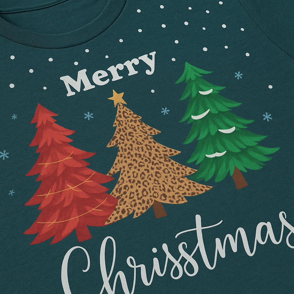 Diseño frontal con estampado de árboles navideños y frase “Merry Christmas”.