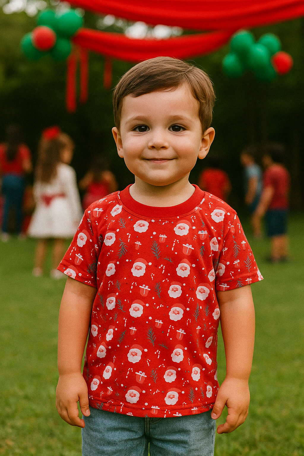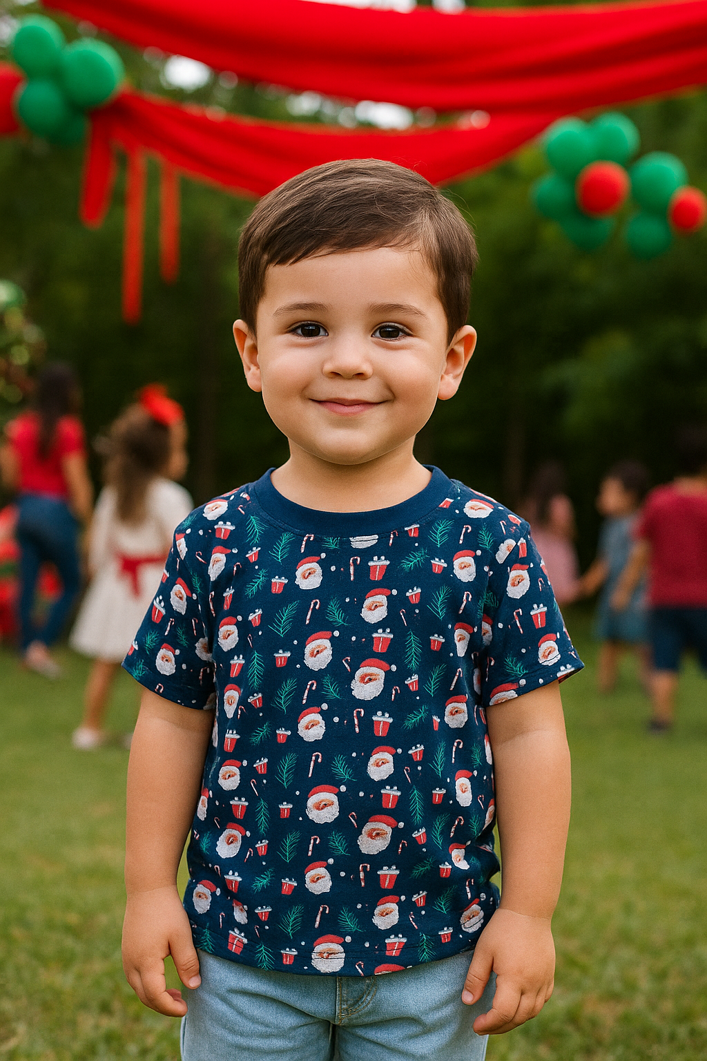 Camiseta navideña para niños y niñas con un diseño festivo que combina diversión y estilo. Su estampado con figuras de Santa Claus, bastones de caramelo y regalos transmite el espíritu alegre de la temporada. Ideal para celebraciones familiares, fotos navideñas o eventos escolares.