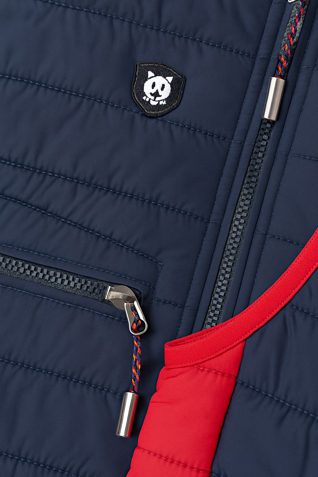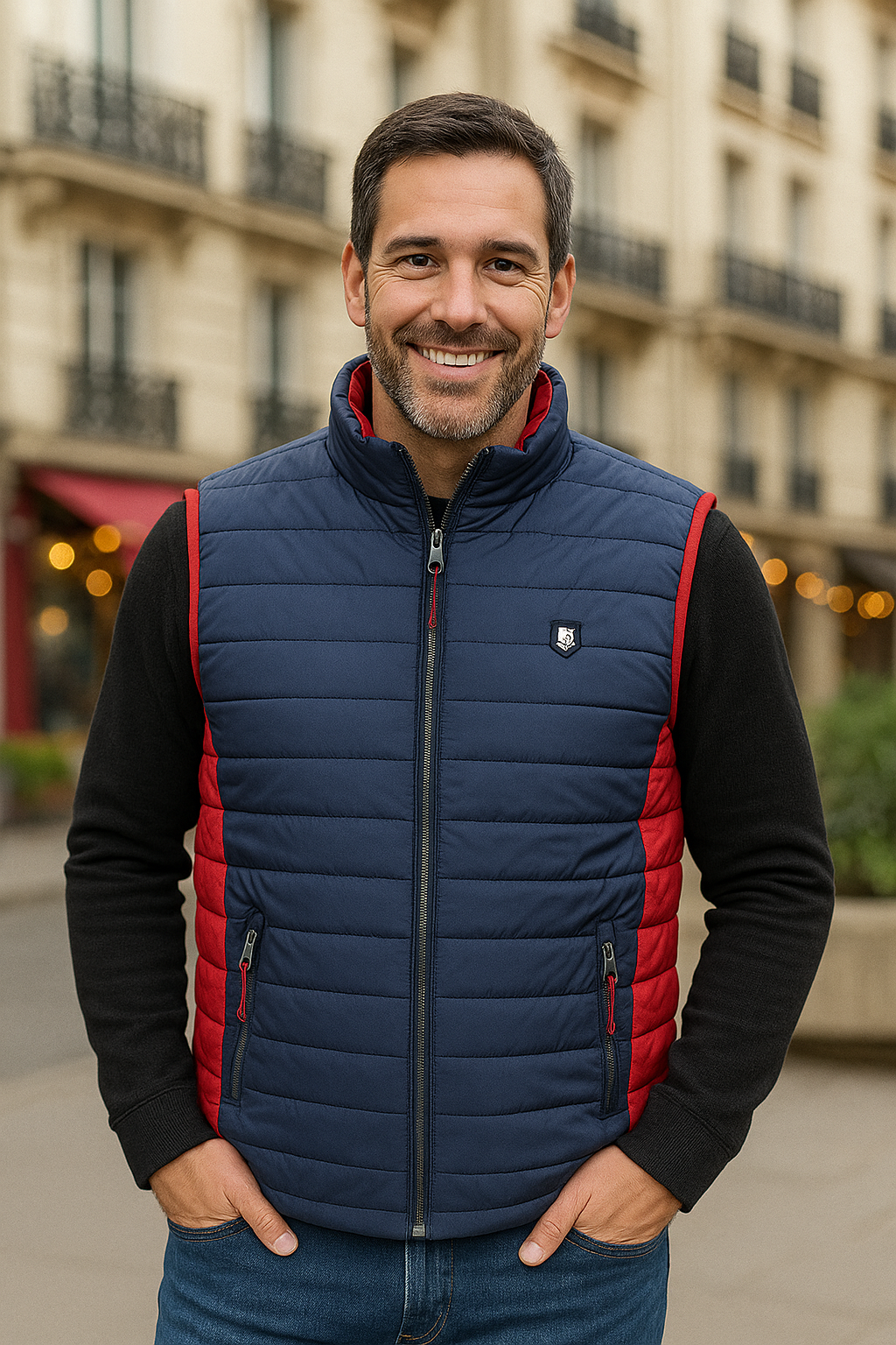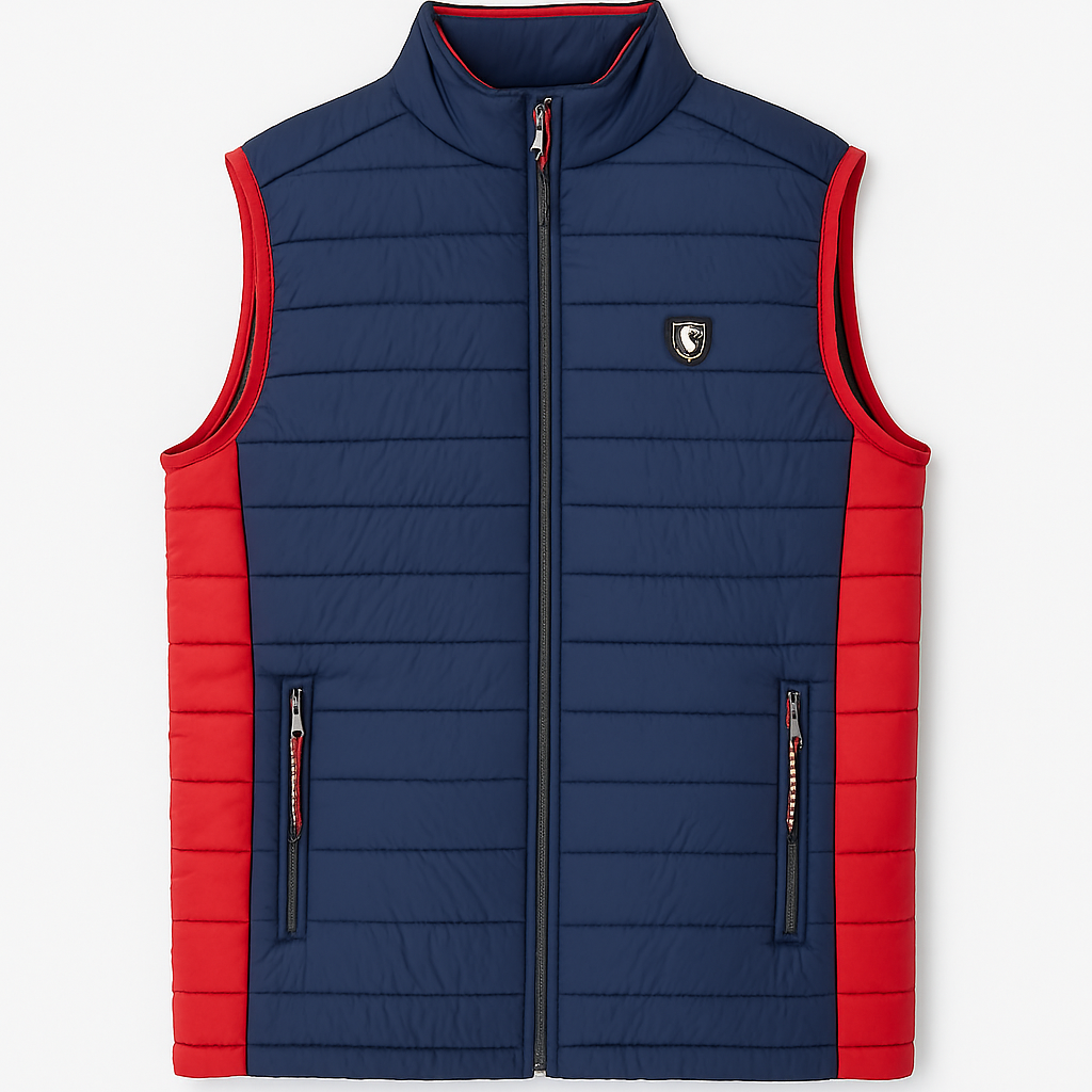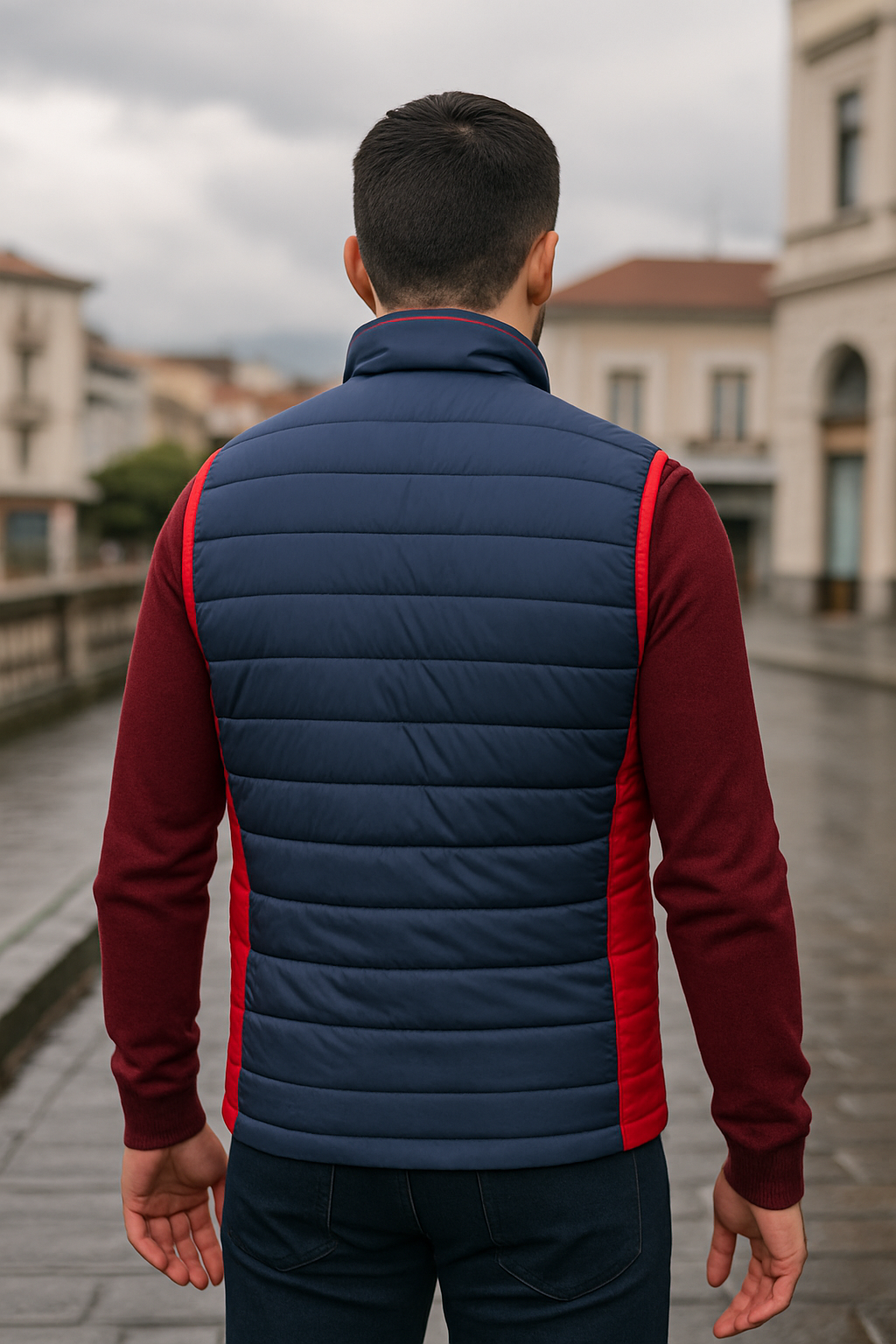CHALECO BICOLOR ACOLCHADO E IMPERMEBALE CON ADORNO EN PECHO, CUELLO ALTO, ABERTURA Y BOLSILLOS DE CIERRE