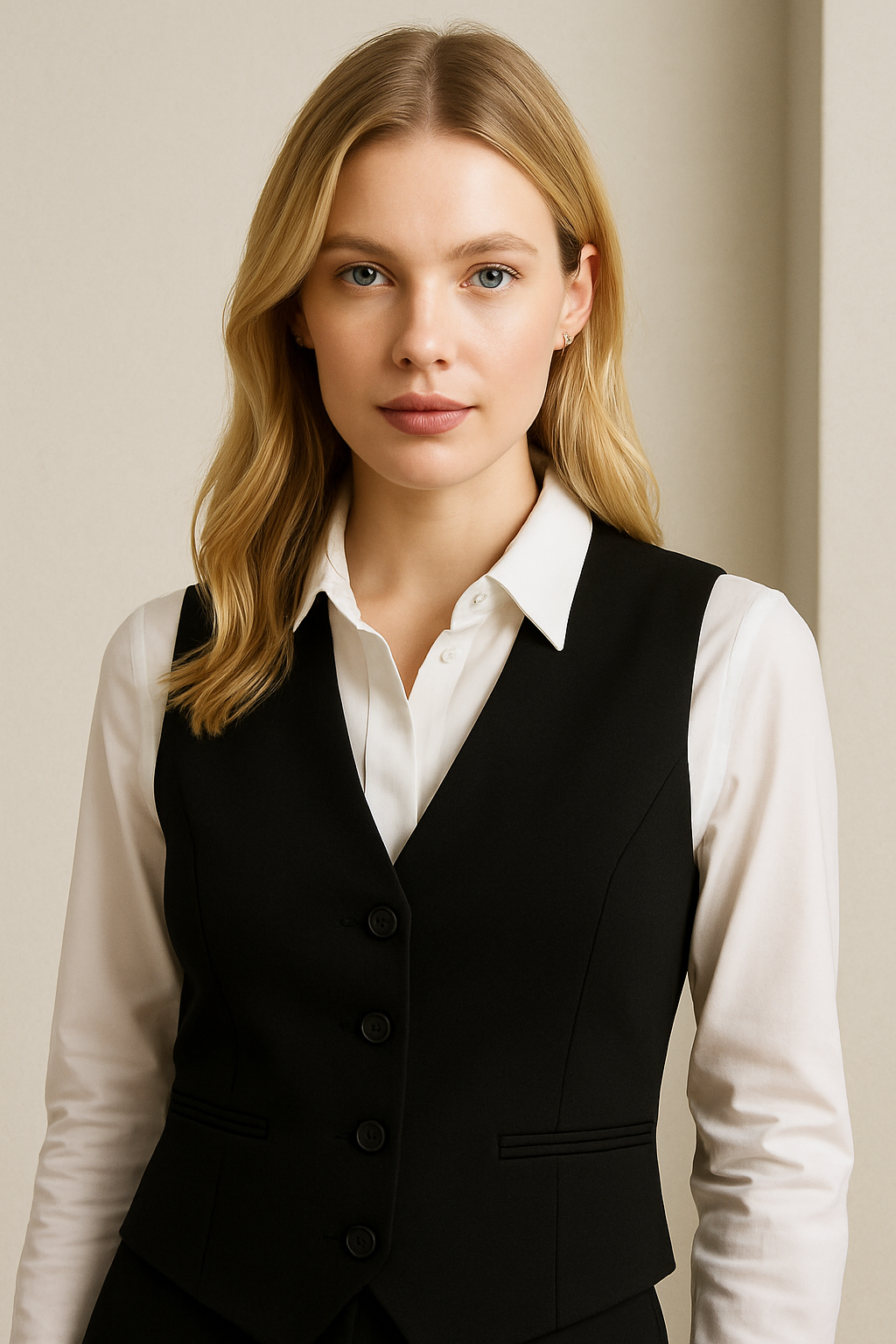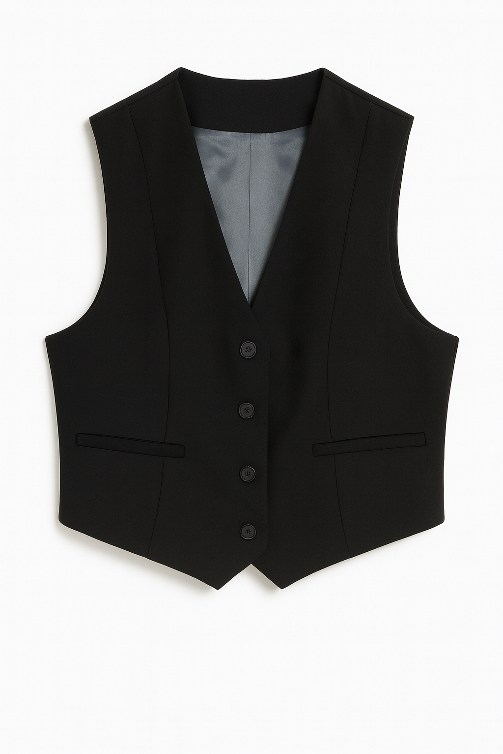 Chaleco negro de corte sastre, confeccionado en una tela de alta calidad con estructura firme y acabado suave al tacto. Su diseño entallado resalta la figura y ofrece una apariencia elegante y moderna. Cuenta con cierre frontal de botones, bolsillos tipo ribete y forro interior que aporta comodidad y durabilidad. Es una prenda versátil, ideal para complementar atuendos formales o elevar un look casual con un toque de sofisticación.