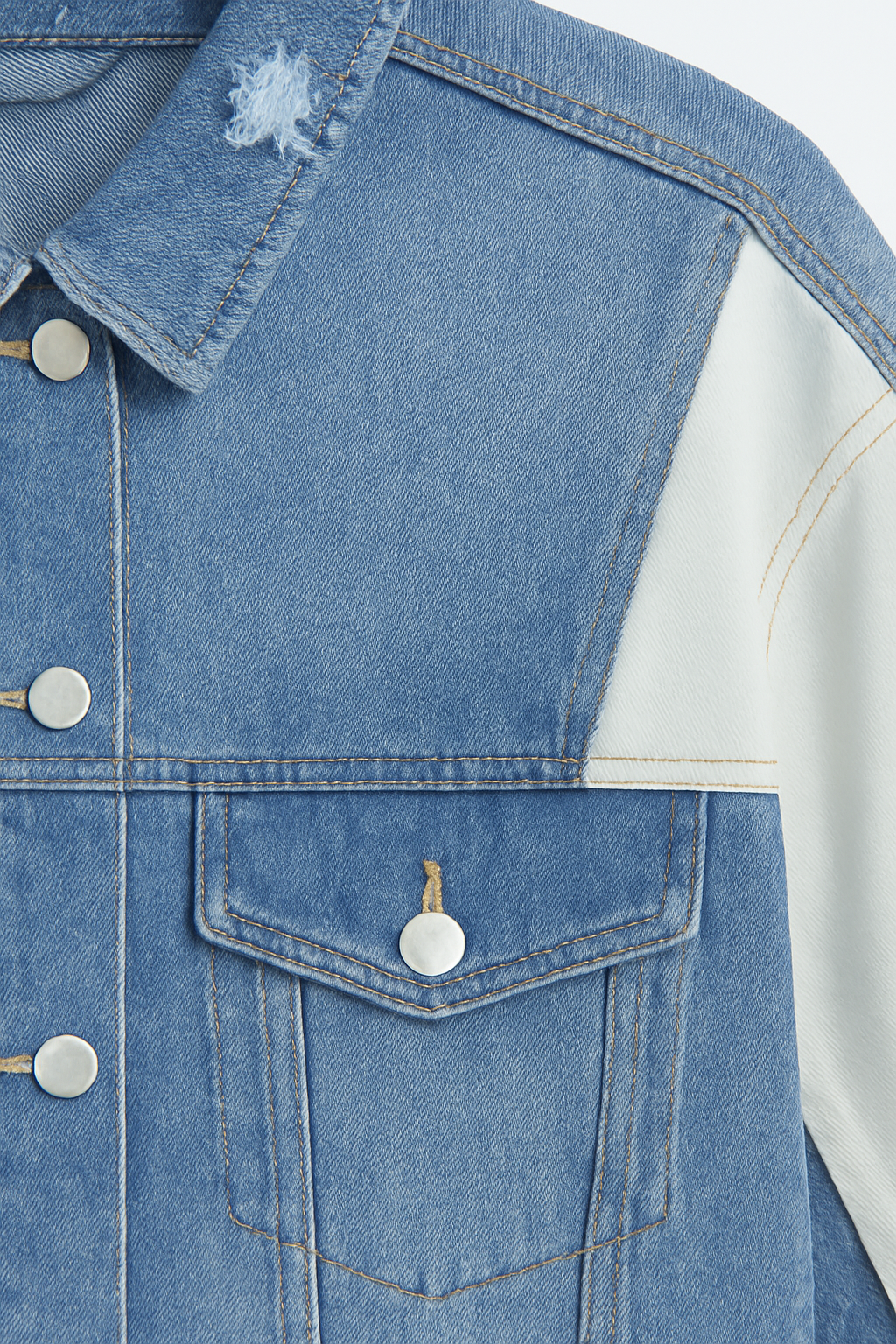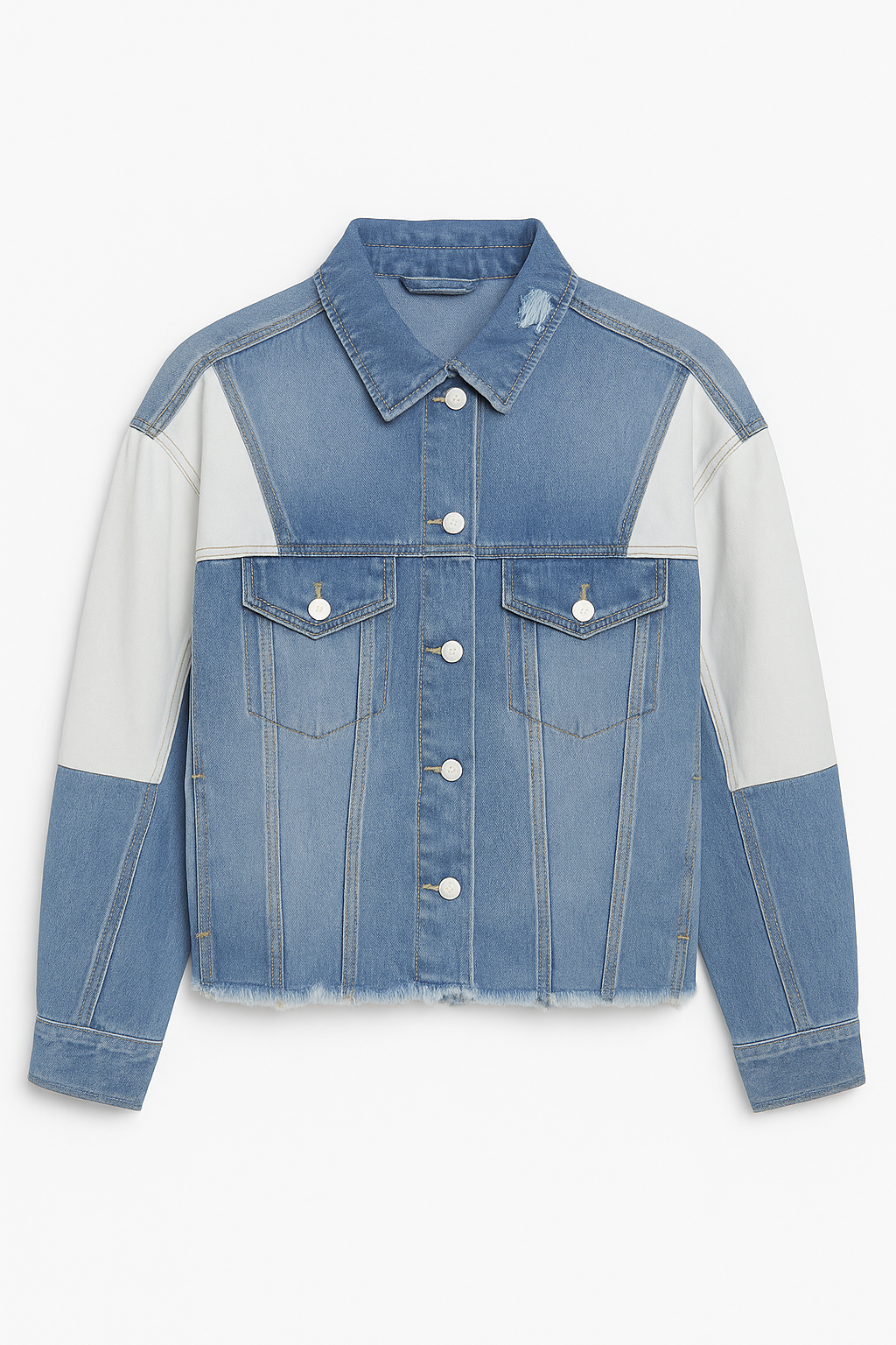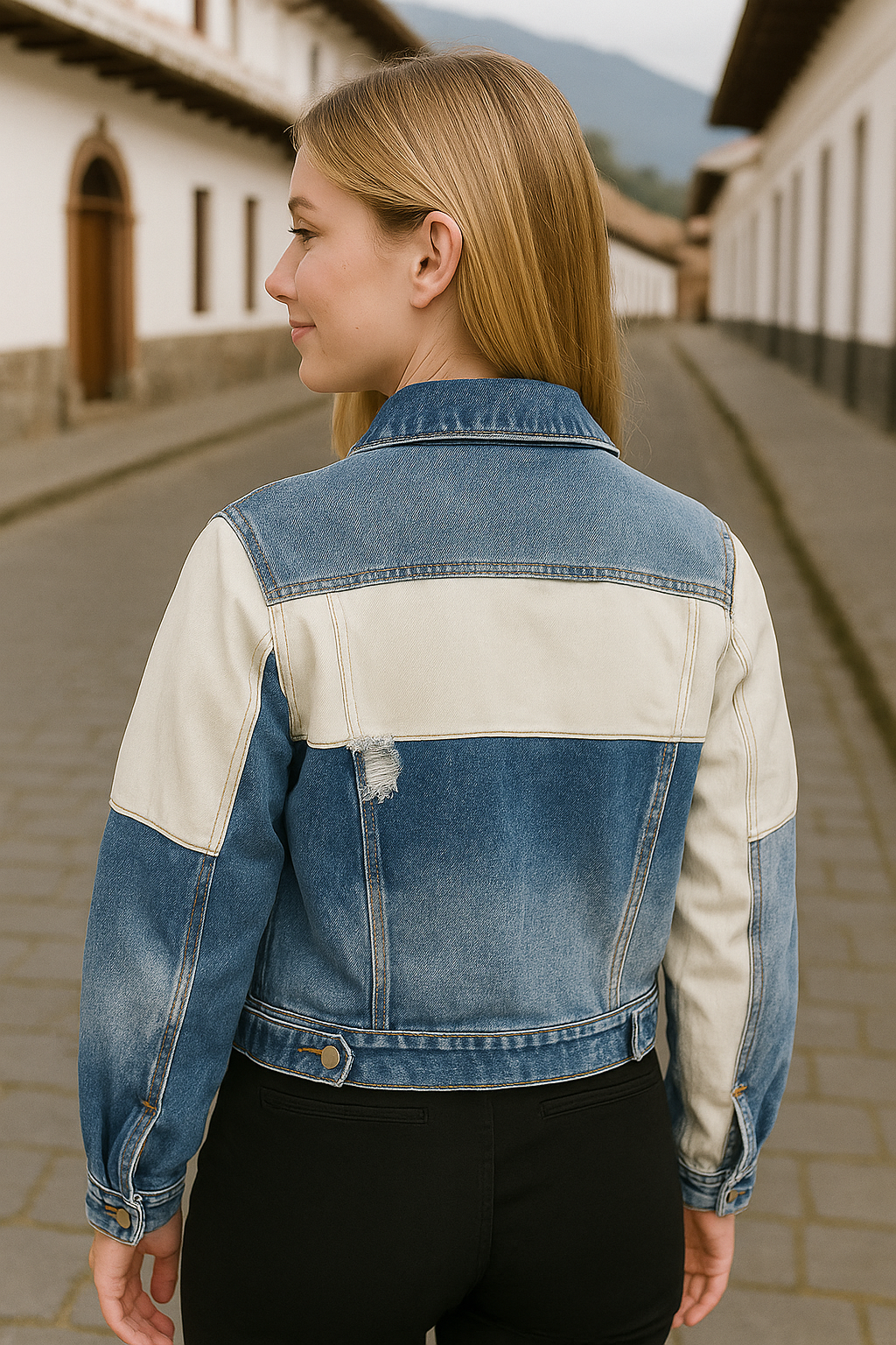 Dale un giro moderno a tus looks con esta chaqueta denim tipo patchwork, ideal para quienes aman el estilo urbano con actitud. Confeccionada en mezclilla de varios tonos, esta prenda combina bloques de denim azul medio, azul claro y blanco, creando un contraste visual único. Los acabados deshilachados en cuello, puños y bajo le dan un toque desgastado y rebelde que marca tendencia.