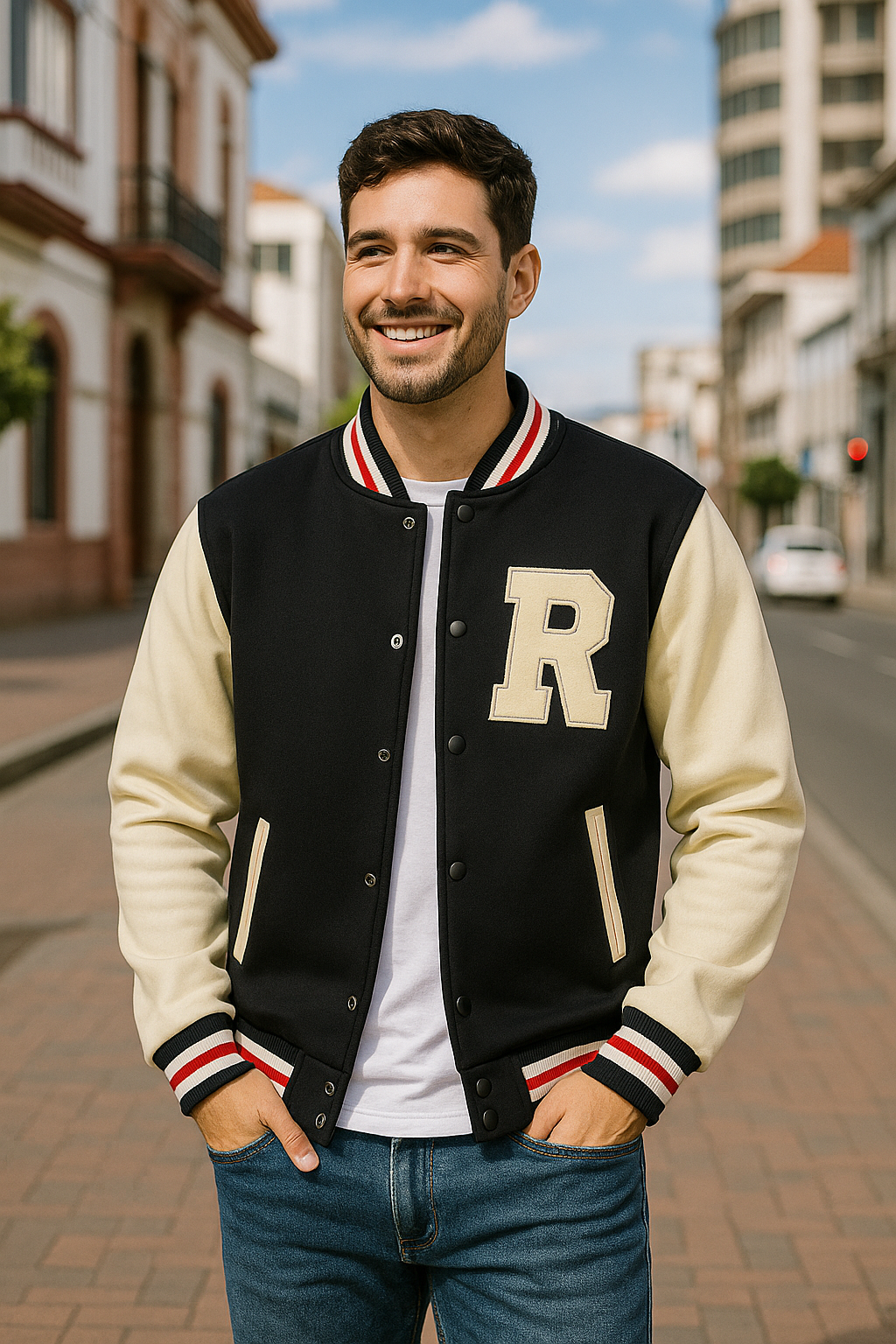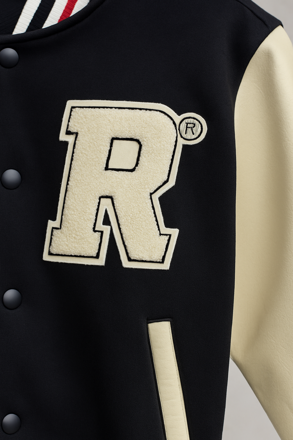 Diseñada con mangas de cuero sintético, cuerpo en tela resistente y cuello redondo con detalle de línea roja, esta chaqueta no solo resalta visualmente, sino que también ofrece confort y durabilidad. El logo R&R bordado aporta identidad y carácter, mientras que los botones a presión en el frente completan su estética retro-college con un toque contemporáneo.