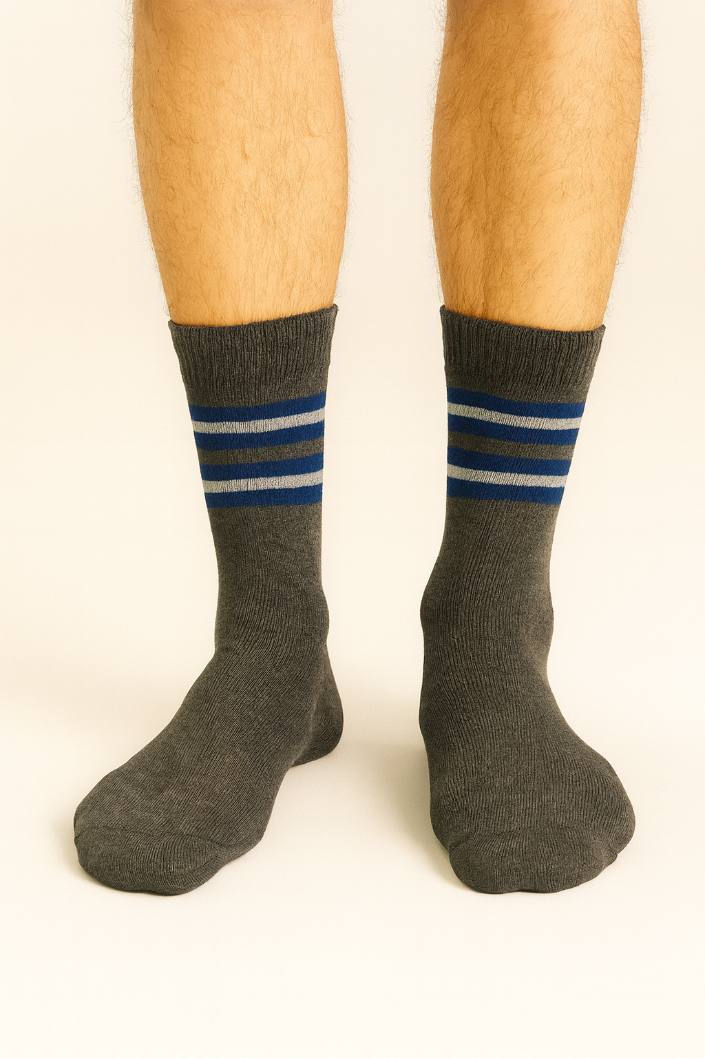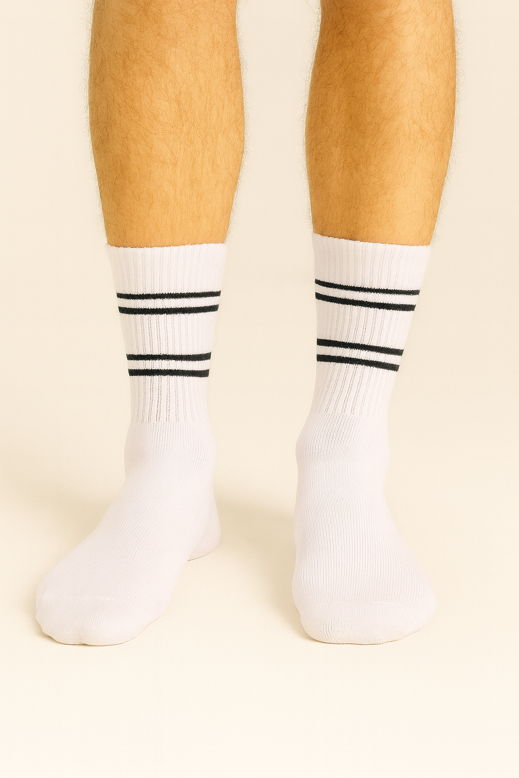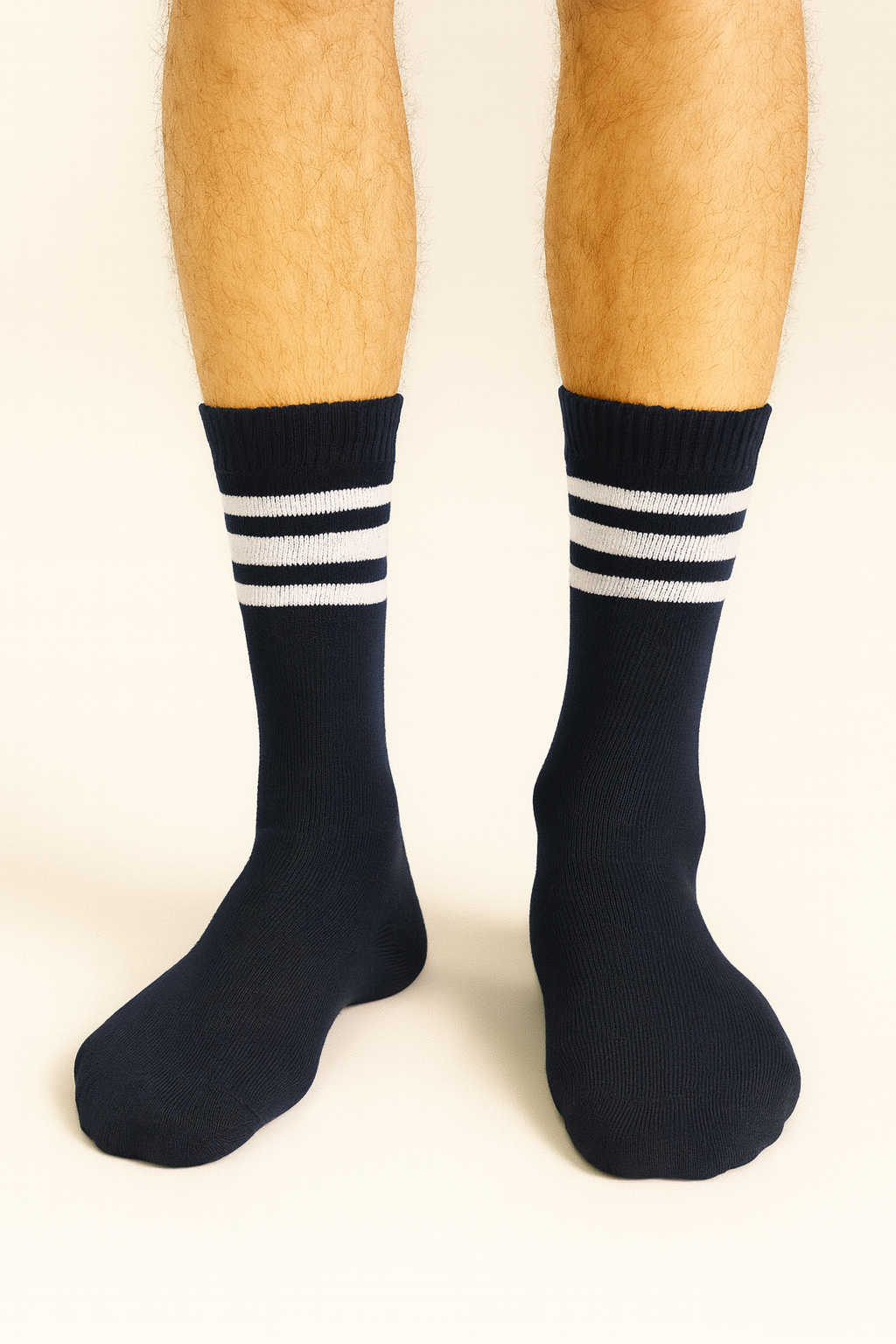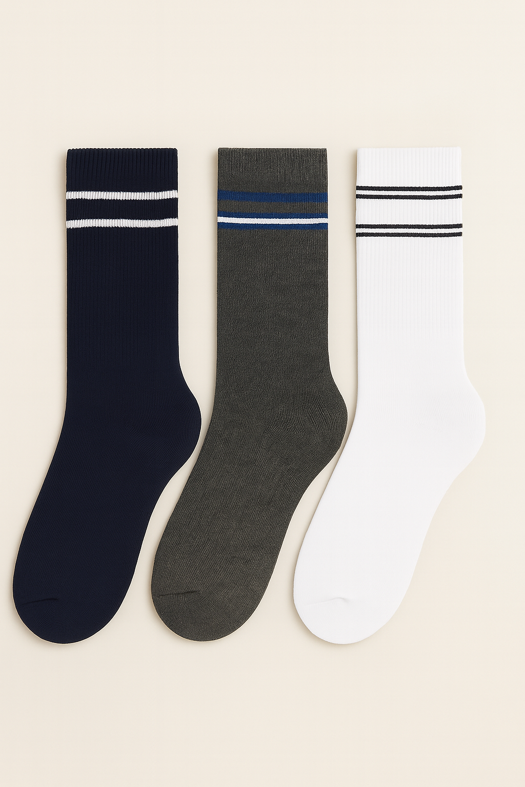 Pack de tres medias de caña media con diseño clásico de líneas en contraste, ideales para quienes buscan un toque deportivo y elegante al mismo tiempo. Fabricadas con tejido suave, elástico y duradero, garantizan comodidad durante todo el día y se adaptan fácilmente a distintos estilos.