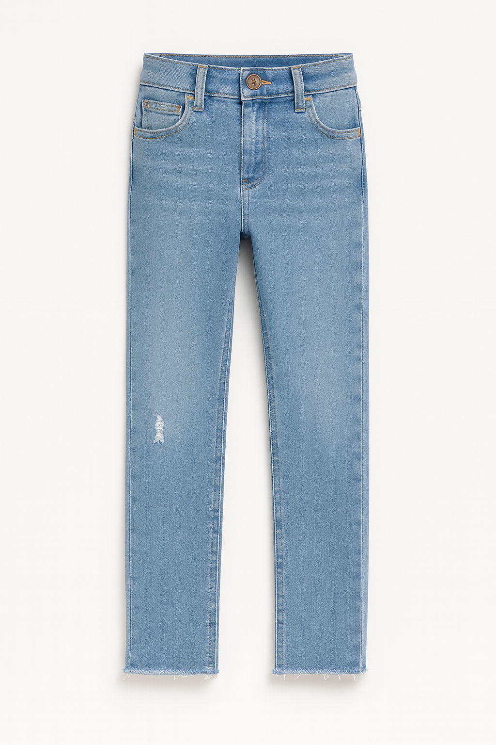 Jean para niña en tono celeste con diseño recto, ideal para un look fresco y moderno. Su detalle de basta desflecada y un pequeño rasgado frontal le dan un estilo casual y juvenil, manteniendo la comodidad y resistencia de un pantalón clásico.
