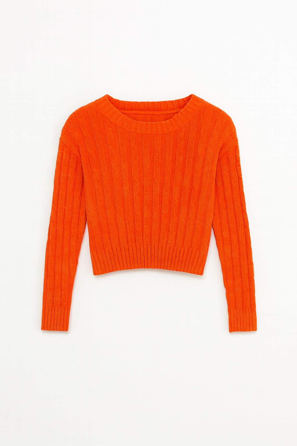 Suéter tejido de diseño moderno con corte crop, ideal para un look juvenil y en tendencia. Confeccionado en un material suave y cómodo, en color naranja vibrante que aporta energía y estilo a cualquier outfit. Su cuello redondo y mangas largas lo hacen versátil para distintas ocasiones.